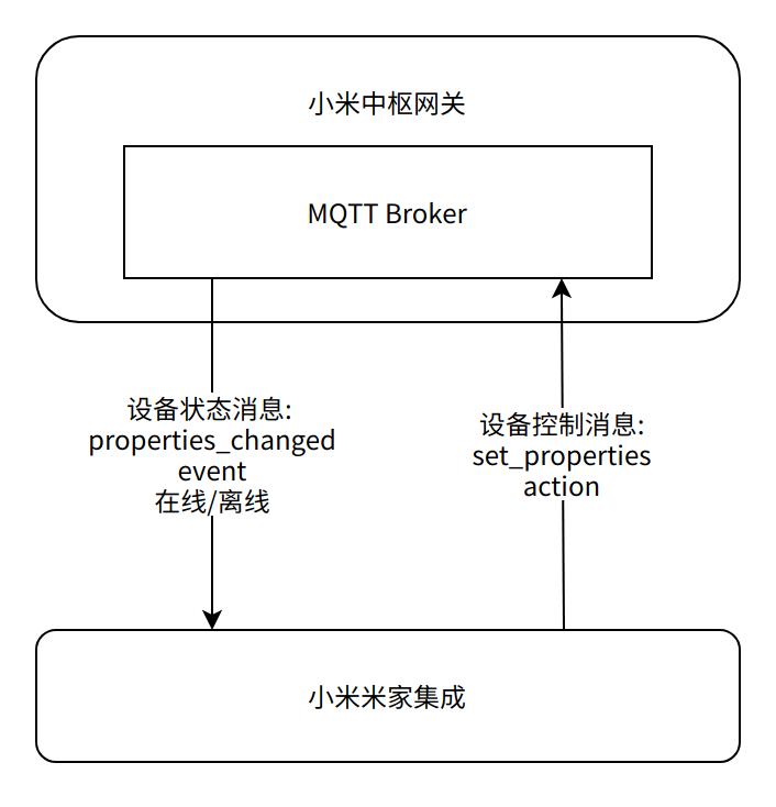 小米中枢网关内包含一个标准的 MQTT Broker ,实现了完整的订阅发布机制。米家集成向小米中枢网关订阅关注的设备消息。当设备属性发生改变或产生设备事件时,设备向小米中枢网关发送上行消息, MQTT Broker 向米家集成推送订阅的设备消息。 米家集成需要控制设备时,向 MQTT Broker 发布设备控制消息,再经由小米中枢网关转发给设备。设备收到小米中枢网关发来的下行消息后做出响应。 ## MIoT-Spec-V2 与 Home Assistant 实体的映射关系 [MIoT-Spec-V2](https://iot.mi.com/v2/new/doc/introduction/knowledge/spec) 的全称为 MIoT Specification Version 2 ,是小米 IoT 平台制订的物联网协议,用于对 IoT 设备进行规范化的功能性描述,其中包含功能定义(其他 IoT 平台称之为物模型)、交互模型、消息格式以及编码。 在 MIoT-Spec-V2 中,一个产品定义为一个设备,一个设备包含若干服务,一个服务包含若干属性、方法和事件。米家集成根据 MIoT-Spec-V2 生成对应的 Home Assistant 实体。 具体的转换关系如下: ### 一般转换规则 - 属性(Property) | access(访问方式) | format(数据格式) | value-list(取值列表) | value-range(取值范围) | 转换后的实体 | | ------------------ | ------------------ | ---------------------- | ----------------------- | ------------ | | 可写 | string | - | - | Text | | 可写 | bool | - | - | Switch | | 可写 | 非 string、非 bool | 有 | - | Select | | 可写 | 非 string、非 bool | 无 | 有 | Number | | 不可写 | - | - | - | Sensor | - 事件(Event) 转换后的实体为 Event,事件参数同时传递给实体的 `_trigger_event` 。 - 方法(Action) | in(输入参数列表) | 转换后的实体 | | ------------------ | ------------ | | 空 | Button | | 非空 | Notify | 如果开启了“Action 调试模式”,方法的 in 字段为非空时,还会生成 Text 实体。 Notify 实体详情页中 Attributes 会显示输入参数的格式。输入参数为有序的列表,英文中括号[]包括。字符串元素由英文双引号""包括。 例如, xiaomi.wifispeaker.s12 siid=5 aiid=5 方法( Intelligent Speaker Execute Text Directive )在 Notify 实体详情页显示的输入参数格式为 `[Text Content(str), Silent Execution(bool)]` ,使用的输入参数可以是 `["Hello", true]` 。 ### 特殊转换规则 MIoT-Spec-V2 定义类型使用的 URN 格式为 `urn::::[::]`,其中 `name` 是用于描述实例(设备、服务、属性、事件、方法)的有意义的单词或词组。米家集成先用实例名称( name )判断是否将 MIoT-Spec-V2 实例转换成特定的 Home Assistant 实体。对于不符合特殊转换规则的 MIoT-Spec-V2 实例,再使用一般转换规则进行转换。 `namespace` 用于描述实例所属的命名空间,取值为“miot-spec-v2”表示小米定义的规范, 取值为“bluetooth-spec”表示蓝牙联盟定义的规范,其他则为厂商自定义的规范。当 `namespace` 不是“miot-spec-v2”时,转换后的实体名称前会显示一个星号\*。 - 设备(Device) 转换规则为 `SPEC_DEVICE_TRANS_MAP` : ``` { '':{ 'required':{ '':{ 'required':{ 'properties': { '': set }, 'events': set, 'actions': set }, 'optional':{ 'properties': set, 'events': set, 'actions': set } } }, 'optional':{ '':{ 'required':{ 'properties': { '': set }, 'events': set, 'actions': set }, 'optional':{ 'properties': set, 'events': set, 'actions': set } } }, 'entity': str } } ``` device instance name 下的 required 表示必须包含的服务, optional 表示可选的服务, entity 表示转换后的实体。 service instance name 下的 required 表示必须包含的属性、事件、方法,optional 表示可选的属性、事件、方法。 required 、 properties 域下的 property instance name 的值表示属性的访问方式,匹配成功的条件是 property instance name 的值是相应 MIoT-Spec-V2 属性实例的访问方式的子集。 如果 MIoT-Spec-V2 设备实例缺少必选的服务、属性、事件、方法,则不会生成 Home Assistant 实体。 - 服务(Service) 转换规则为 `SPEC_SERVICE_TRANS_MAP` : ``` { '':{ 'required':{ 'properties': { '': set }, 'events': set, 'actions': set }, 'optional':{ 'properties': set, 'events': set, 'actions': set }, 'entity': str } } ``` service instance name 下的 required 表示必须包含的属性、事件、方法,optional 表示可选的属性、事件、方法, entity 表示转换后的实体。 required 、 properties 域下的 property instance name 的值表示属性的访问方式,匹配成功的条件是 property instance name 的值是相应 MIoT-Spec-V2 属性实例的访问方式的子集。 如果 MIoT-Spec-V2 服务实例缺少必选的属性、事件、方法,则不会生成 Home Assistant 实体。 - 属性(Property) 转换规则为 `SPEC_PROP_TRANS_MAP` : ``` { 'entities':{ '':{ 'format': set, 'access': set } }, 'properties': { '':{ 'device_class': str, 'entity': str } } } ``` entity name 下的 format 表示属性的数据格式,匹配上一个值即为匹配成功; access 表示属性的访问方式,匹配上所有值才算匹配成功。 property instance name 下的 entity 表示转换后的实体,取值为 entities 下的 entity name ; device_class 表示转换后实体所用的 `_attr_device_class` 。 - 事件(Event) 转换规则为 `SPEC_EVENT_TRANS_MAP` : ``` { '': str } ``` event instance name 下的值表示转换后实体所用的 `_attr_device_class` 。 ### MIoT-Spec-V2 过滤规则 `spec_filter.json` 用于过滤掉不需要的 MIoT-Spec-V2 实例,过滤掉的实例不会转换成 Home Assistant 实体。 `spec_filter.json`的格式如下: ``` { "":{ "services": list, "properties": list, "events": list, "actions": list, } } ``` `spec_filter.json` 的键值为 MIoT-Spec-V2 设备实例的 urn (不含版本号“version”字段)。一个产品的不同版本的固件可能会关联不同版本的 MIoT-Spec-V2 设备实例